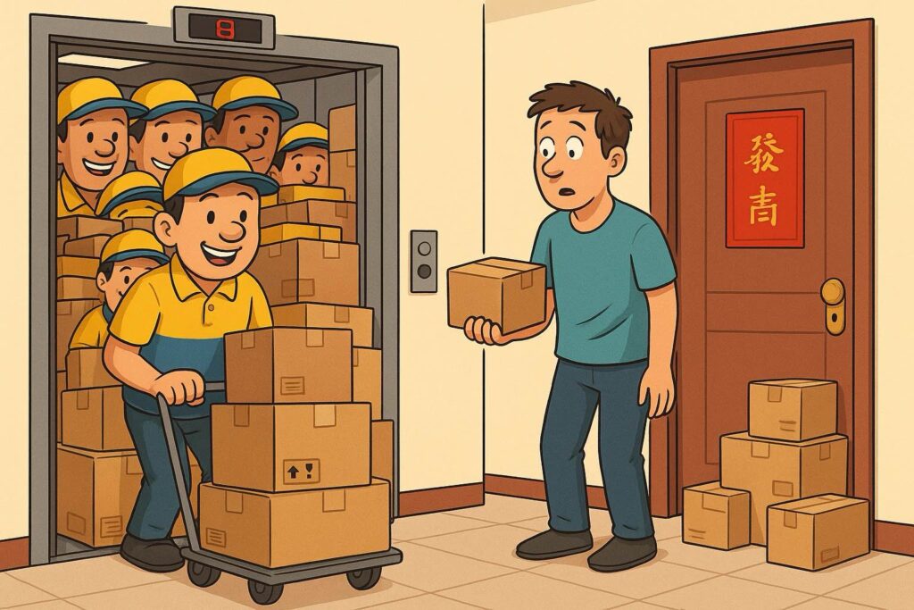 When you get home, the show continues. These high-rises – thirty, forty floors, four apartments per floor. Somewhere inside, there’s always a box with your name on it. You step into the elevator, and there he is: the courier. One man, one cart, twenty parcels. He presses every button – 7, 9, 12, 18, 23, 28 – and the elevator sounds like it’s praying.