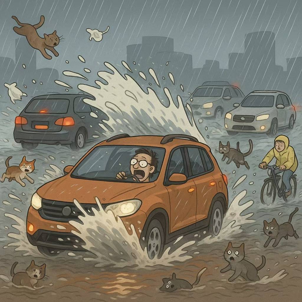 Rainy season in China. Sounds harmless, almost romantic – like sitting by the window with a cup of tea, listening to the gentle patter. But this is no patter. This is Bruce Lee in weather form: fast, hard, and utterly relentless. Imagine a German snowstorm – not the “15 centimeters and the trains stop” kind – no, I’m talking about the 1970s kind, with two meters of snow burying half the country. Only here, it’s not snow. It’s water. And not just water – cats, dogs, plastic bags, half a clothes rack, and occasionally something your neighbor “temporarily stored” on the balcony three weeks ago.