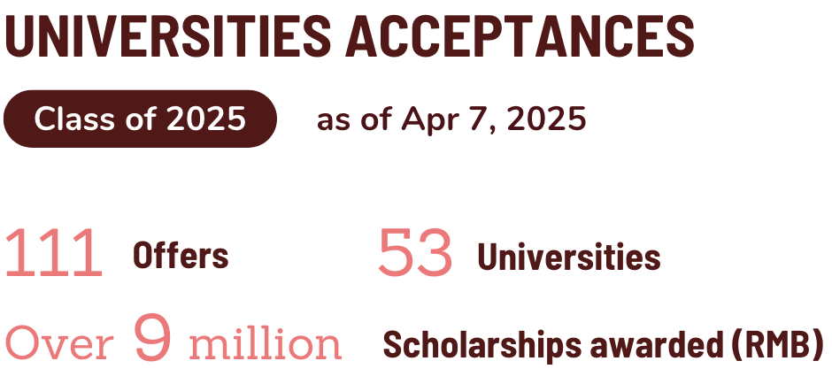This year, ISNS students have been accepted into 111 programs across 53 universities in Canada, the United Kingdom, the United States, Hong Kong, and beyond, with total scholarship awards surpassing 9 million RMB.