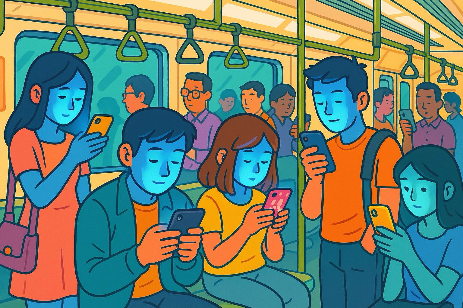 Faces? Almost gone. What you see now are silhouettes behind glass. People are only recognizable by their cases: pink with bunnies, black with skulls, transparent with crumbs. Sometimes I catch a face in the elevator and it startles me – like an archaeologist stumbling over a fossil he thought extinct: human expression. And the creepiest thing: in the dark, whole crowds glow like a colony of deep-sea fish, faces eerily lit from below by their screens, eyes hollow, skin bluish. It’s less public transport, more séance.